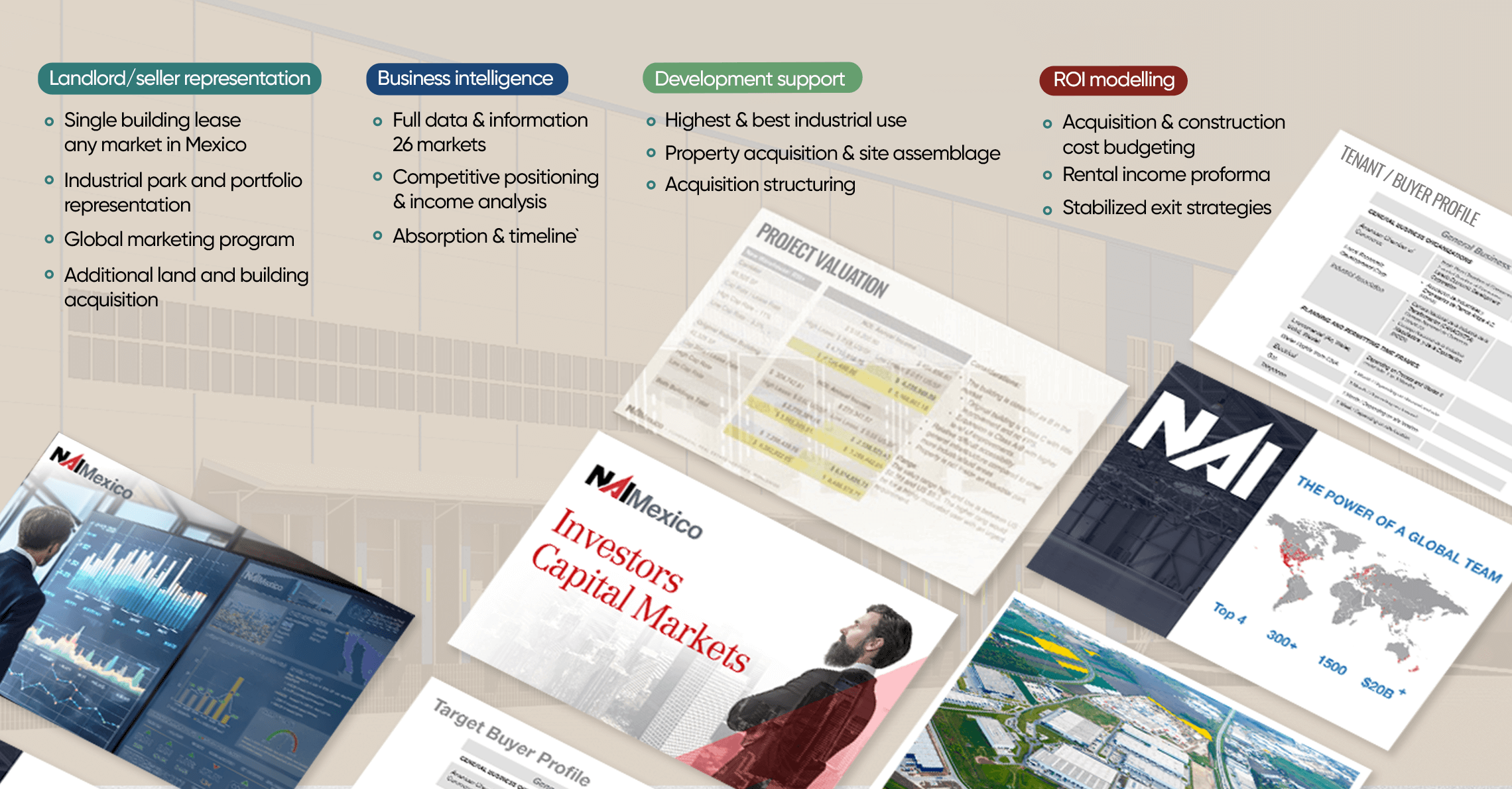 NAI advises real estate developers regarding multiple markets in Mexico, total project cost, architectural & engineering, permitting, development proformas, cash flows, lease comparables, joint ventures, and construction costs.